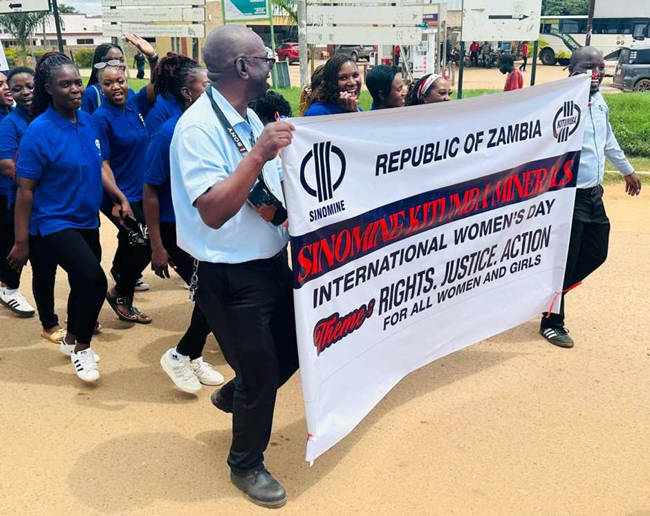 Sinomine Kitumba minerals employees participating in the International Women’s Day route march from Four Ways stop to Mumbwa secondary school.